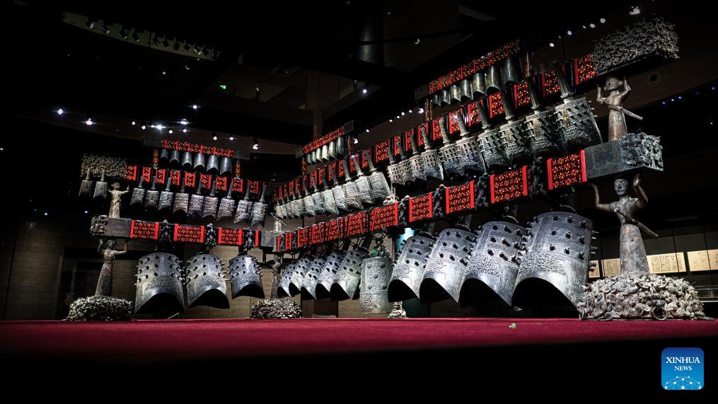 The Bianzhong of Marquis Yi of Zeng is pictured in Hubei Provincial Museum in Wuhan, central China's Hubei Province, April 17, 2025. Three documentary heritage collections submitted by China have been inscribed in the UNESCO Memory of the World Register, the United Nations Educational, Scientific and Cultural Organization announced on Thursday. Among the 74 newly added entries, China contributed two solo submissions - the Bianzhong of Marquis Yi of Zeng and the Steles of Shaolin Temple - as well as a joint submission with Sri Lanka: the Trilingual Inscription. (Xinhua/Xiao Yijiu)