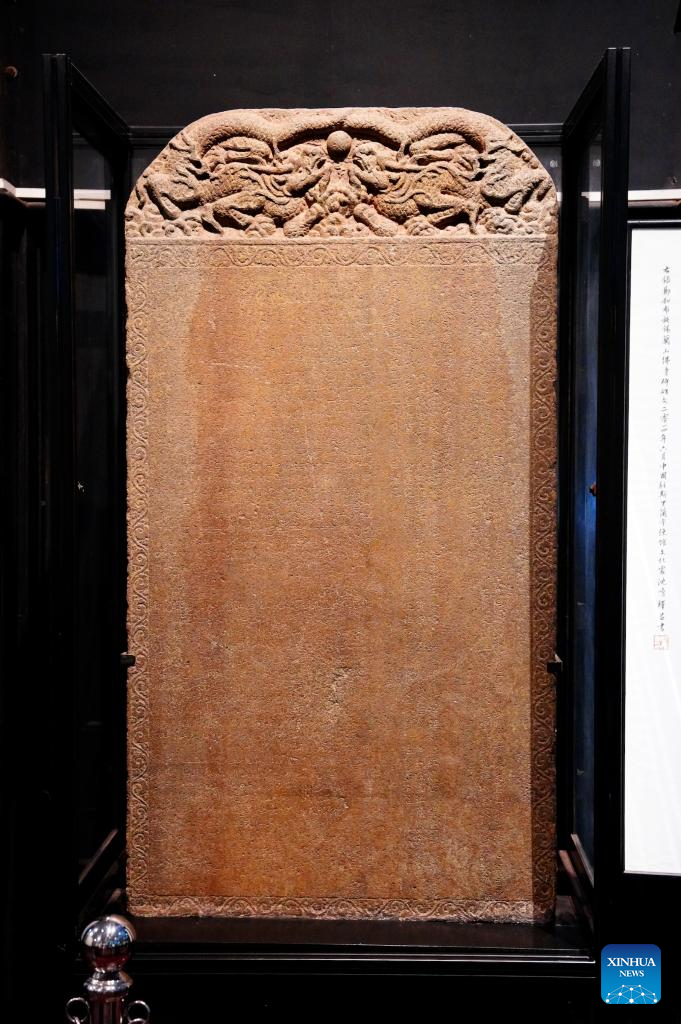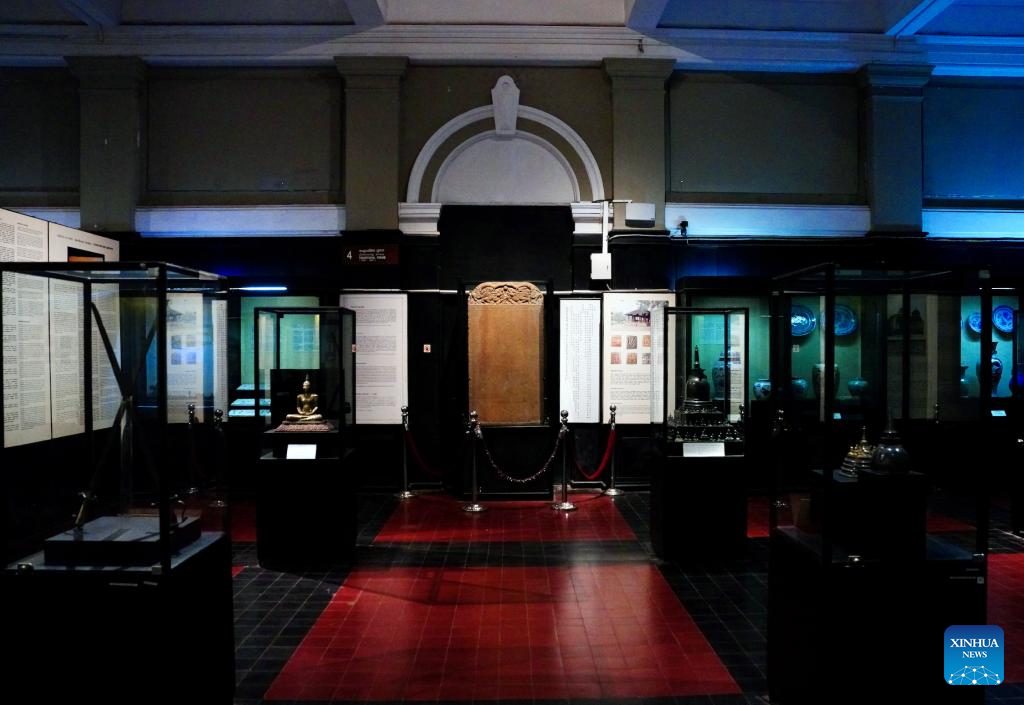 This photo taken on April 17, 2025 shows the Trilingual Inscription exhibited at the Colombo National Museum in Colombo, Sri Lanka. Three documentary heritage collections submitted by China have been inscribed in the UNESCO Memory of the World Register, the United Nations Educational, Scientific and Cultural Organization announced on Thursday. Among the 74 newly added entries, China contributed two solo submissions - the Bianzhong of Marquis Yi of Zeng and the Steles of Shaolin Temple - as well as a joint submission with Sri Lanka: the Trilingual Inscription. (Xinhua/Wu Yue)