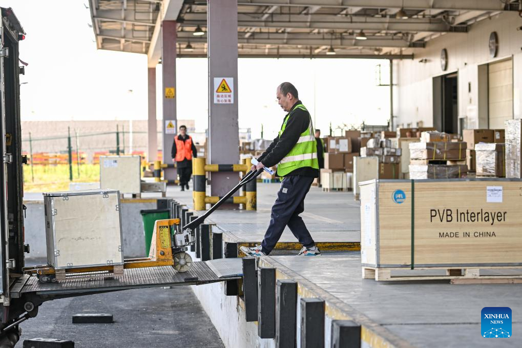 A worker of China Southern Air Logistics transports cargos at the international cargo terminal of Beijing Daxing International Airport in Beijing, capital of China, April 14, 2025. (Xinhua/Chen Zhonghao)