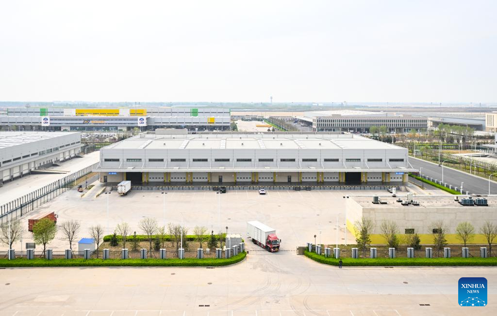 BEIJING, April 17 (Xinhua) -- A truck loaded with 1.3 tonnes of clothing, hats, sunglasses and other goods departed from the cross-border e-commerce warehouse at the comprehensive bonded zone of Beijing Daxing International Airport (BDIA), heading to the international cargo terminal of China Southern Air Logistics Co., Ltd. at the airport.