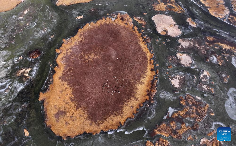 A drone photo taken on April 8, 2025 shows observers watching birds at Qinghai Longbao National Nature Reserve, located within Yushu City of Yushu Tibetan Autonomous Prefecture, northwest China's Qinghai Province. From a bird's eye view, the densely built houses of Yushu City nestle in mountain valleys, while the Batang River meanders through the city like a jade belt. The cityscape of Yushu presents a distinct sense compared to the traditionally perceived cold and arid highland cities. It resembles a city of water with the rich waterways of the Yangtze River source enveloping the main urban area in lush wetlands. (Xinhua/Zhang Hongxiang)
