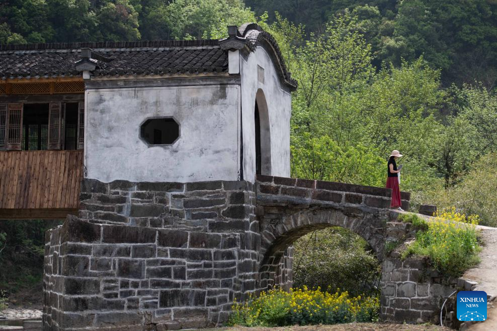 This photo taken on April 11, 2025 shows the Gongbei roofed bridge in Xiuning County of Huangshan City, east China's Anhui Province. Roofed bridge, also called covered bridge, is a unique architectural structure in Huangshan City. These ingeniously structured and elegantly shaped bridges carry rich cultural significance and form a distinctive part of Huizhou culture.