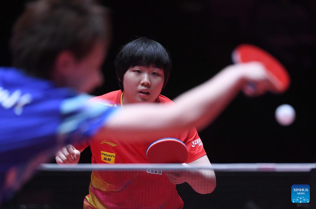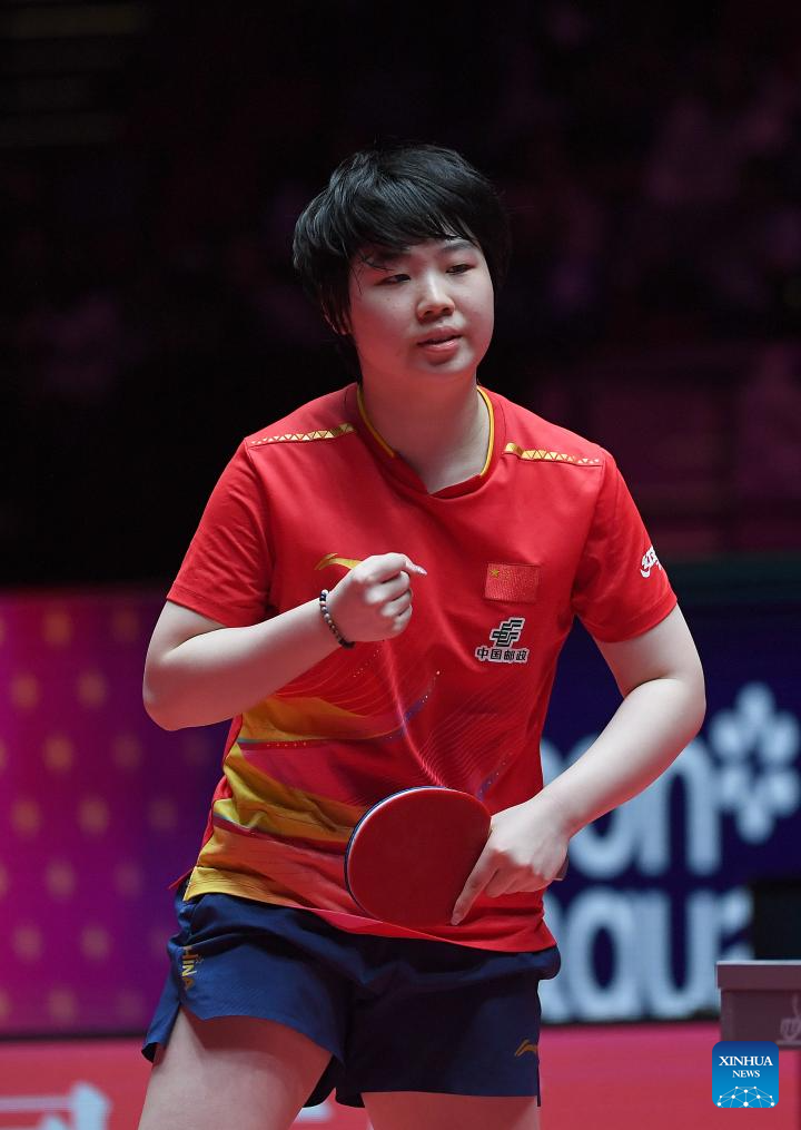 Kuai Man competes during the women's singles quarterfinal match between Kuai Man of China and Wang Manyu of China at the ITTF Men's and Women's World Cup 2025 in Macao, China, April 18, 2025. (Xinhua/Chen Duo)