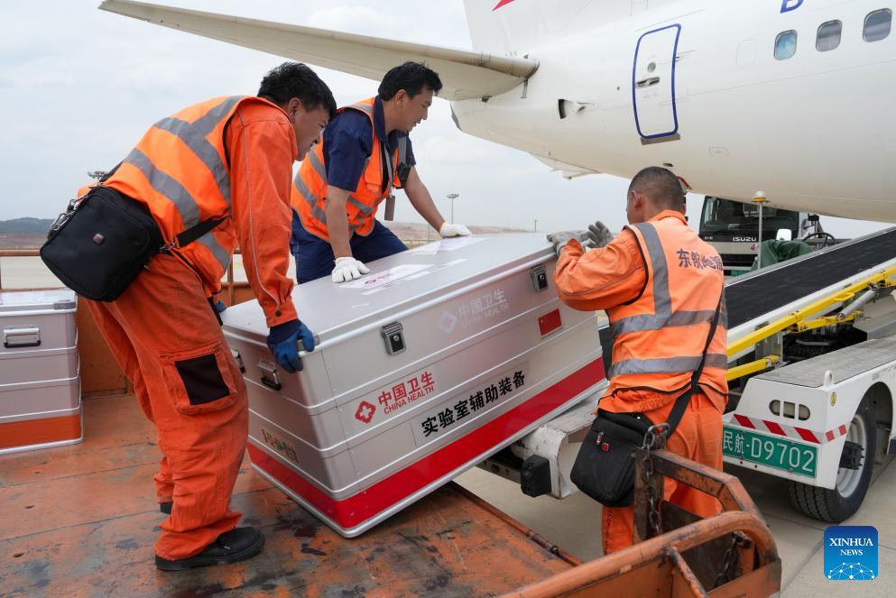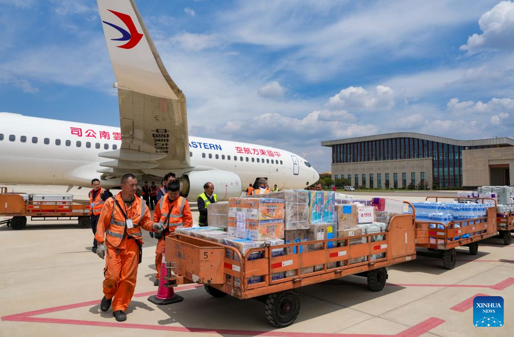 Staff members load public health supplies at the Kunming Changshui International Airport in Kunming, southwest China's Yunnan Province, April 19, 2025. A 50-member Chinese public health team departed for Myanmar on Saturday to support post-earthquake public health efforts there. The 7.9-magnitude earthquake, which jolted Myanmar on March 28, has claimed 3,726 lives and left 5,105 people injured, with 129 others remaining unaccounted for as of April 18, according to Myanmar's State Administration Council Information Team on April 19. (Xinhua/Chen Xinbo)