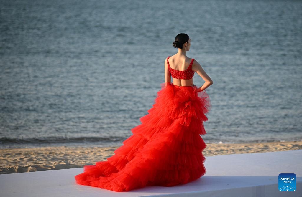 A model presents a fashion design of "La Mofiel" during a seaside show of the 5th China International Consumer Products Expo (CICPE) in Haikou, south China's Hainan Province, April 16, 2025. The 2025 China International Consumer Products Expo (CICPE) fashion show, a side event of the 5th CICPE, staged its closing show here Friday evening.