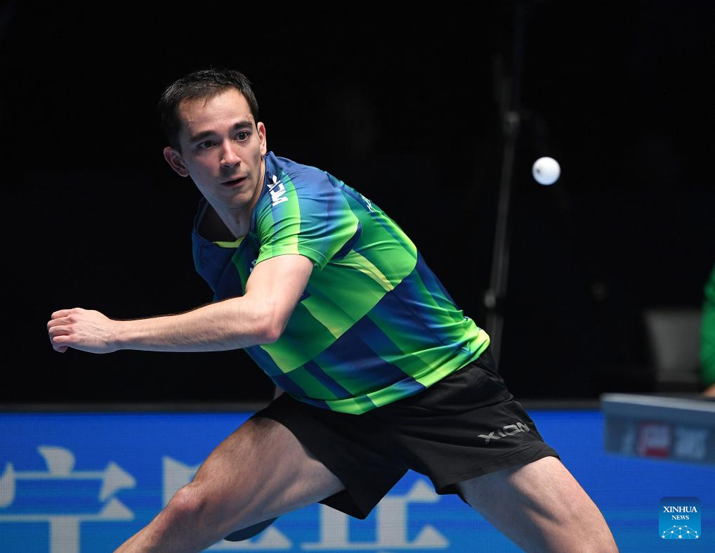 Hugo Calderano hits a return during the men's singles semifinal between Wang Chuqin of China and Hugo Calderano of Brazil at the ITTF Men's and Women's World Cup 2025 in Macao, China, April 19, 2025. (Xinhua/Cheong Kam Ka)