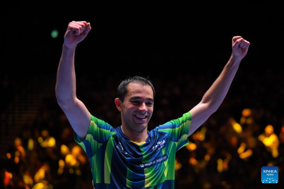 Hugo Calderano celebrates scoring during the men's singles semifinal between Wang Chuqin of China and Hugo Calderano of Brazil at the ITTF Men's and Women's World Cup 2025 in Macao, China, April 19, 2025. (Xinhua/Cheong Kam Ka)