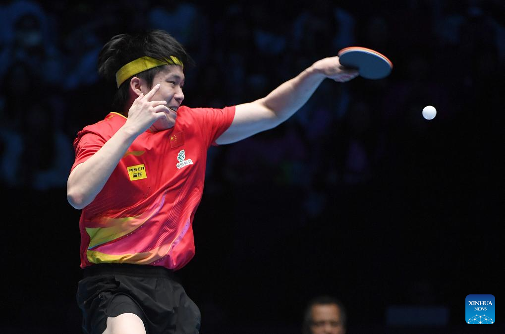 Wang Chuqin hits a return during the men's singles semifinal between Wang Chuqin of China and Hugo Calderano of Brazil at the ITTF Men's and Women's World Cup 2025 in Macao, China, April 19, 2025. (Xinhua/Chen Duo)