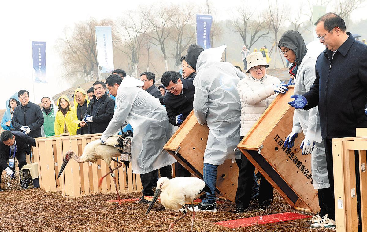 Two oriental storks, listed as first-class protected wildlife, are released to a wetland habitat at Poyang Lake in Jiangxi province in January last year. ZHUO ZHONGWEI/FOR CHINA DAILY
