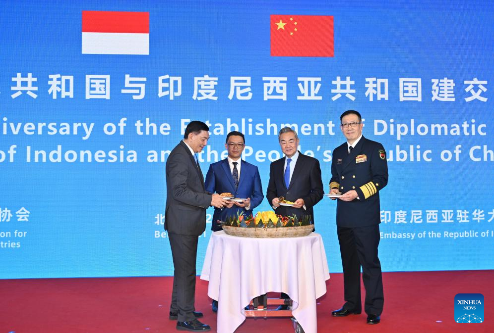 Member of the Political Bureau of the Communist Party of China Central Committee and Foreign Minister Wang Yi, Chinese Defense Minister Dong Jun, Indonesia's Foreign Minister Sugiono and Defense Minister Sjafrie Sjamsoeddin attend a reception marking the 75th anniversary of diplomatic ties between the two countries and the 70th anniversary of the Bandung Conference in Beijing, capital of China, April 21, 2025. (Xinhua/Yue Yuewei)