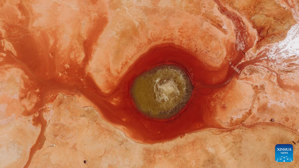 An aerial drone photo taken on April 19, 2025 shows the Aiken Spring in Mangya, Haixi Mongolian and Tibetan Autonomous Prefecture of northwest China's Qinghai Province. Located in northwest China's Qinghai Province, Aiken Spring is dubbed the "Eye of the Earth." This rare geological wonder forms a unique pupil shape from above, with spring water and surrounding deep red sediments resembling an eye embedded in the land. (Xinhua/Wang Bo)