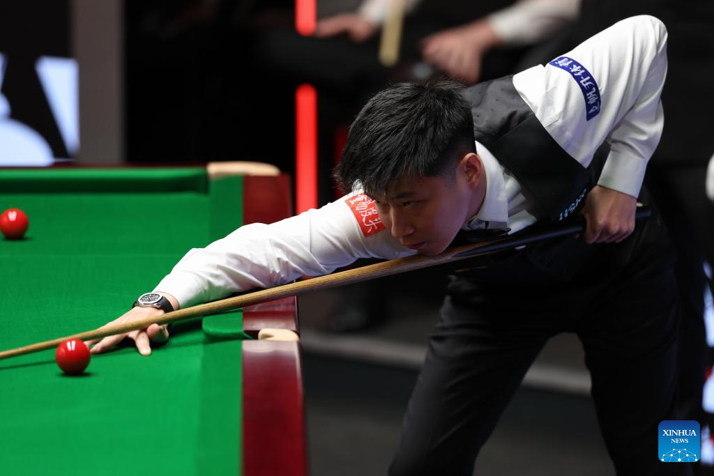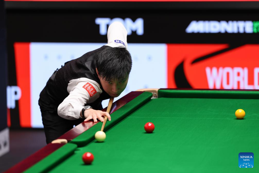 Zhao Xintong of China plays a shot during the round 1 match against Jak Jones of Wales at World Snooker Championship 2025 in Sheffield, Britain, April 21, 2025. (Photo by Zhai Zheng/Xinhua)