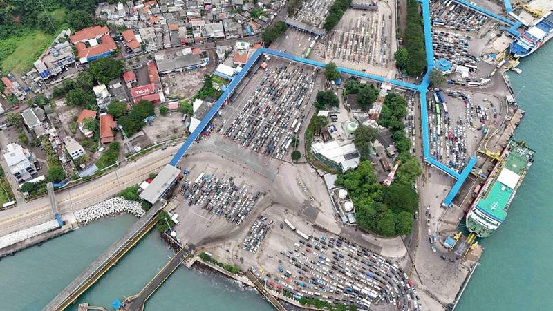 An aerial drone photo shows vehicles waiting to board ferries ahead of the Eid al-Fitr at Merak Port, Banten Province, Indonesia, March 28, 2025. [Photo/Xinhua]