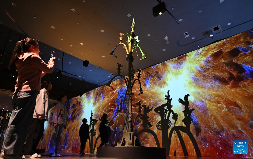 People visit an immersive art exhibition of Sanxingdui at National Maritime Museum of China in north China's Tianjin, April 22, 2025. Through aesthetic design, music, lighting and other digital multimedia means, the recently opened art exhibition provides visitors with an immersive historical space showcasing the art aesthetics, bronze ware culture, sacrificial culture, and spiritual inheritance of the Sanxingdui Ruins. Discovered in the late 1920s in the city of Guanghan, southwest China's Sichuan Province, the Sanxingdui Ruins have been dubbed as one of the world's greatest archaeological finds of the 20th century. (Xinhua/Zhao Zishuo)