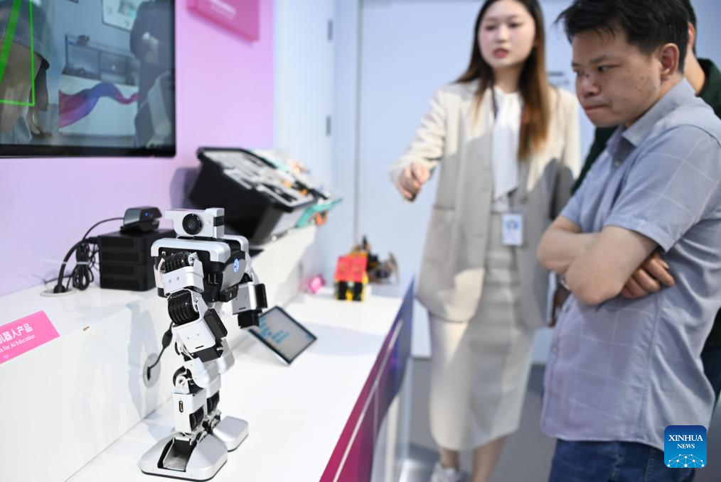 Visitors learn about an educational robot at the exhibiton hall of the tech company UBTECH in Shenzhen, south China's Guangdong Province, March 26, 2025. (Xinhua/Deng Hua)