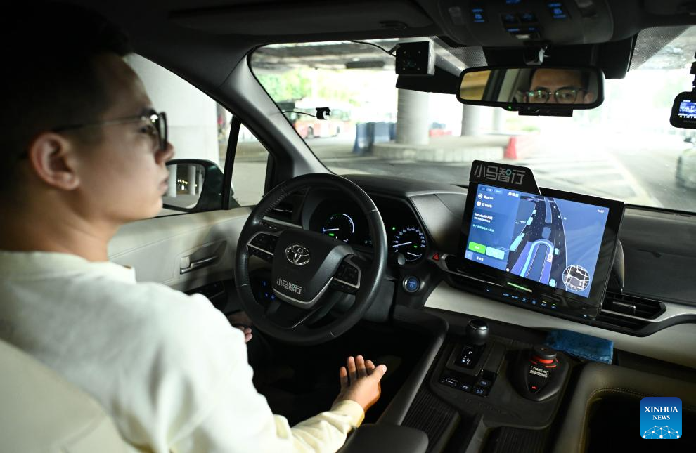 A safety staff member observes as a robotaxi of Pony.ai, a Chinese autonomous driving solution provider, steers automatically at a stopping point at the Canton Tower, a landmark in Guangzhou, south China's Guangdong Province, March 11, 2025. (Xinhua/Deng Hua)