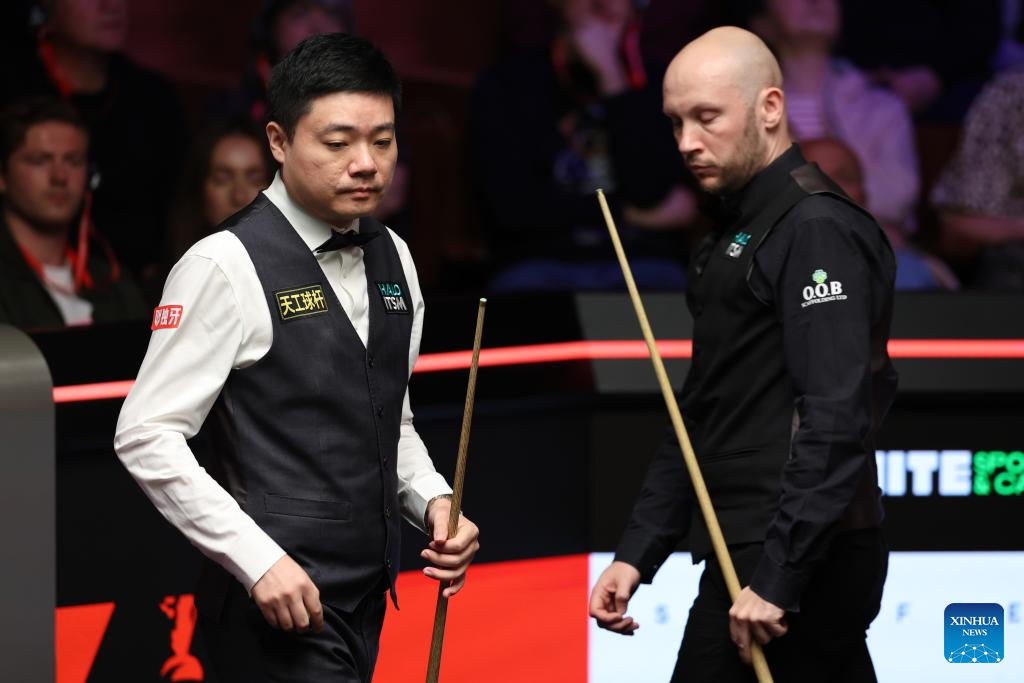Ding Junhui of China competes during the round 1 match against Zak Surety of England at World Snooker Championship 2025 in Sheffield, Britain, April 22, 2025. (Photo by Zhai Zheng/Xinhua)