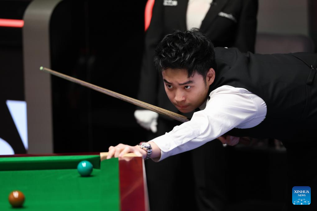 Si Jiahui of China competes during the round 1 match against David Gilbert of England at World Snooker Championship 2025 in Sheffield, Britain, April 22, 2025. (Photo by Zhai Zheng/Xinhua)