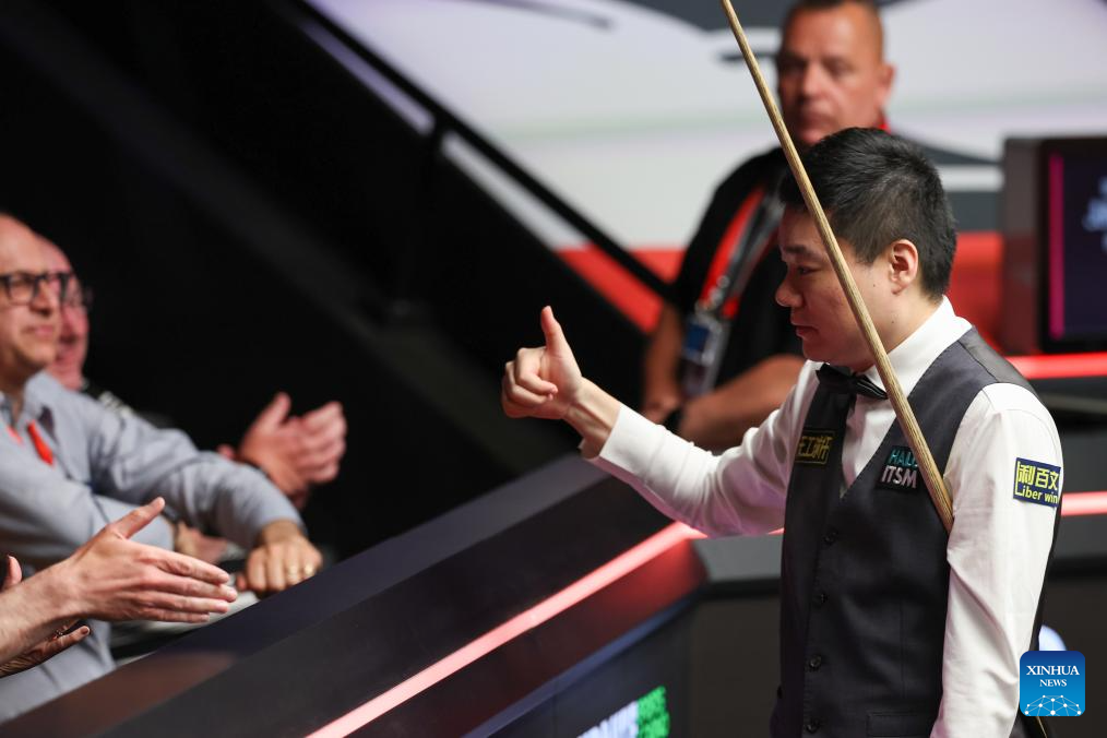 Ding Junhui (R) of China celebrates after the round 1 match against Zak Surety of England at World Snooker Championship 2025 in Sheffield, Britain, April 22, 2025. (Photo by Zhai Zheng/Xinhua)
