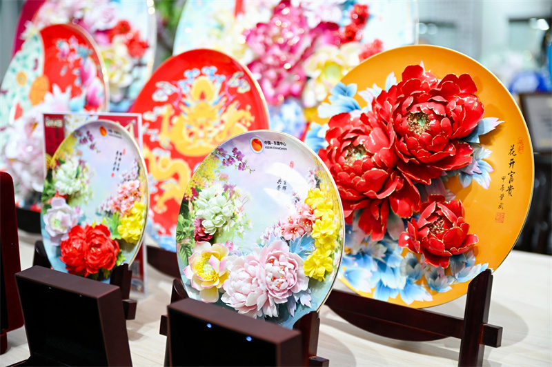 Photo shows peony porcelain handicrafts displayed at the Luoyang Peony Porcelain Museum in Luoyang, central China's Henan Province. (People's Daily Online/Lu Yang)