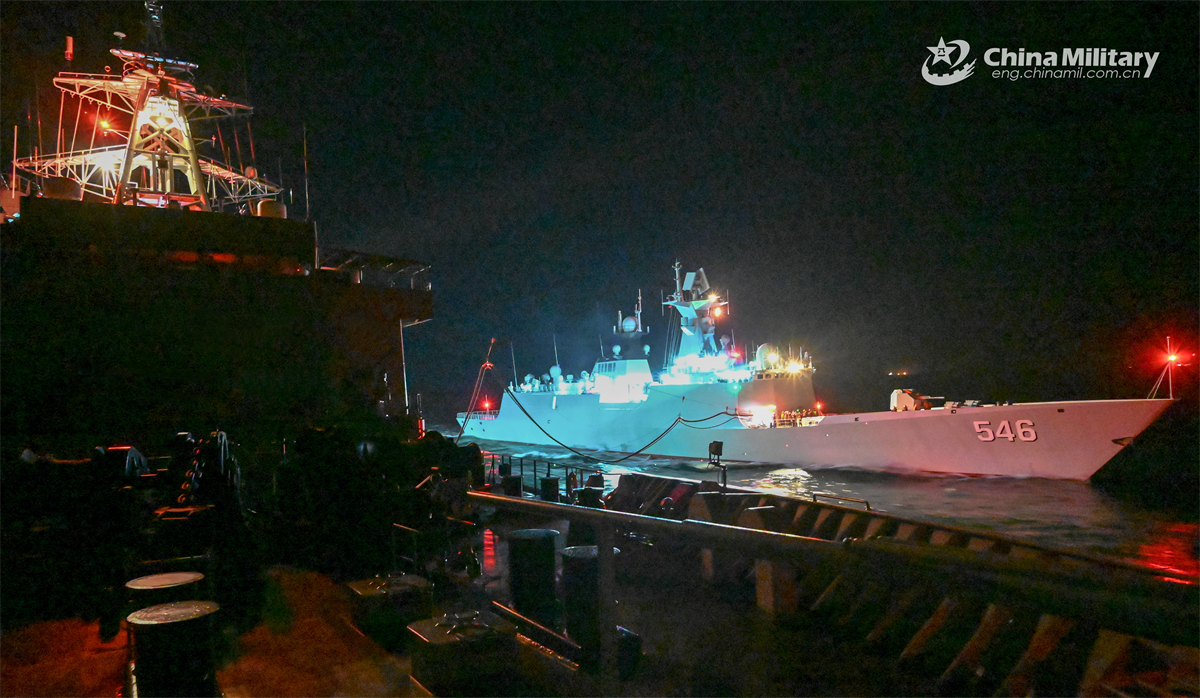 Comprehensive supply ship Taihu (Hull 889) and guided-missile frigate Yancheng (Hull 546) attached to a combat support ship flotilla with the navy under the Chinese PLA Northern Theater Command conduct alongside replenishment-at-sea at night during a maritime training exercise in early April, 2025. (eng.chinamil.com.cn/Photo by Zhou Yuanzhi)