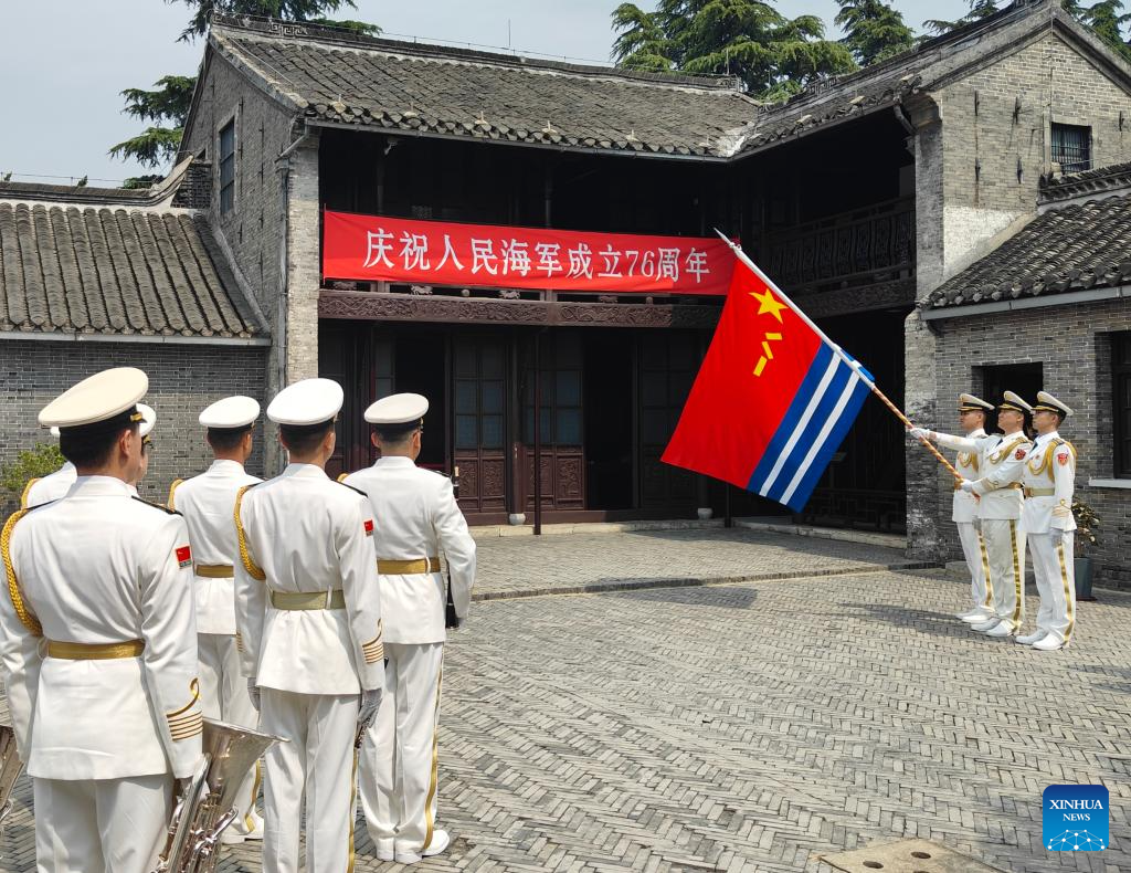 Soldiers participate in a flag-raising ceremony to mark the 76th anniversary of the Chinese People's Liberation Army (PLA) Navy in Qinhuangdao, north China's Hebei Province, April 23, 2025. The Chinese People's Liberation Army (PLA) Navy marked its 76th anniversary on Wednesday, reaffirming its commitment to becoming a world-class naval force dedicated to safeguarding both national security and global peace. (Photo by Wang Guangjie/Xinhua)