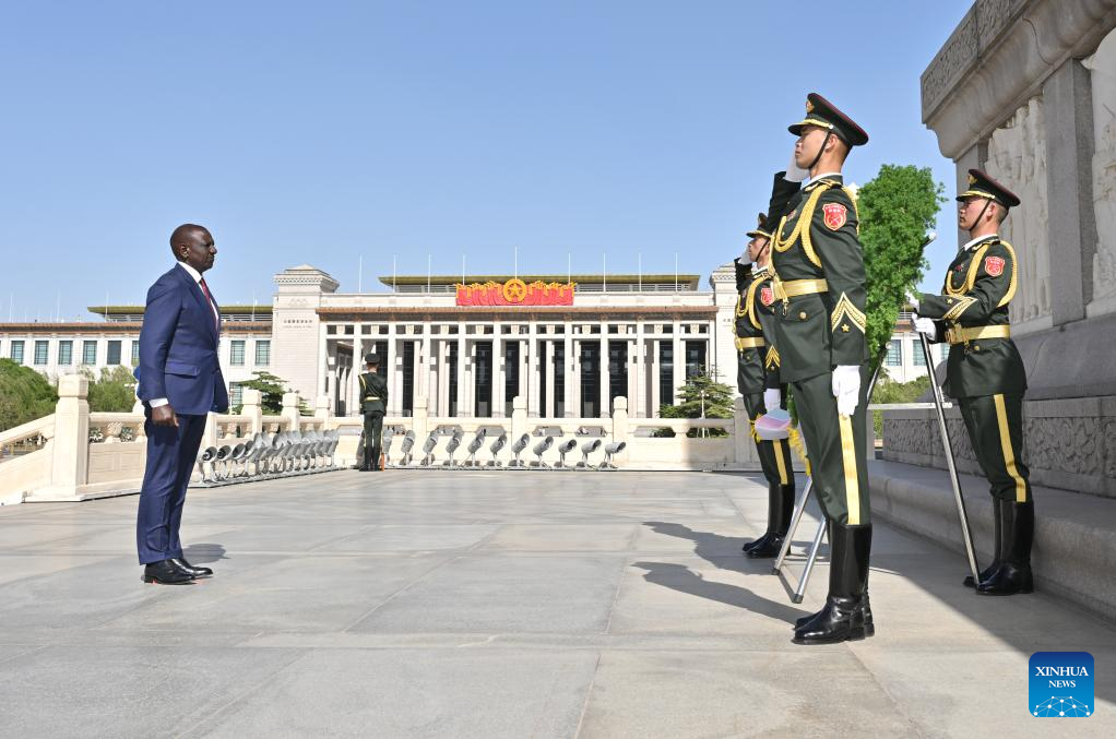 Kenyan president lays wreath at Monument to People's Heroes on Tian'anmen Square in Beijing
