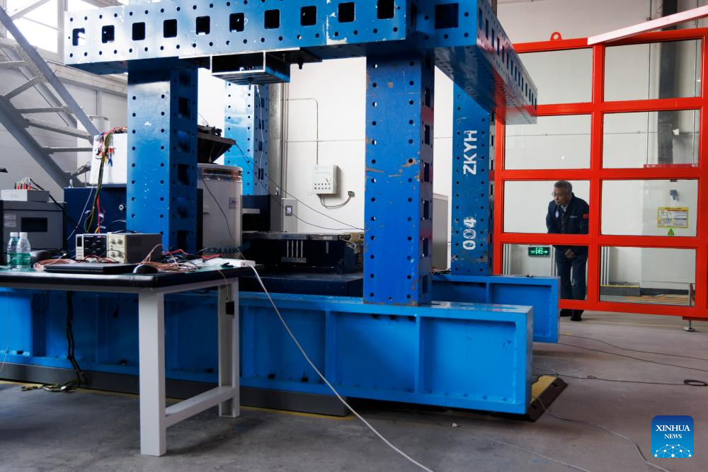 Yang Yiqiang monitors the progress of the vibration test at the CAS Space's experimental center in Beijing, capital of China, April 19, 2025. Yang Yiqiang once served as former commander-in-chief of the Long March-11 rocket project. In December 2018, he founded CAS Space, a company focusing on rocket development and space launch services. CAS Space's Lijian-1 carrier rockets have already completed multiple launches, supporting remote sensing and experimental satellites. The upcoming Lijian-2 rocket will be capable of supporting satellite internet networking technology and cargo transport missions for the China's Space Station. (Xinhua/Jin Liwang)