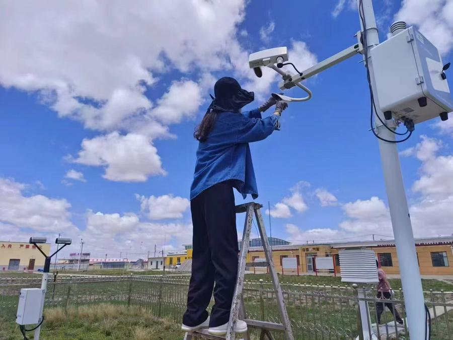 This photo taken with a mobile phone shows a staff member adjusting a meteorological observation device at the Tuotuohe Meteorological Station in northwest China's Qinghai Province, June 30, 2024. (Golmud's meteorological bureau/Handout via Xinhua)