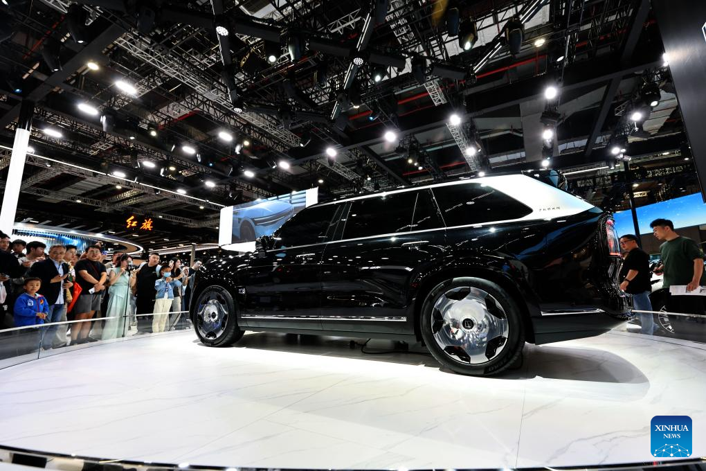Visitors view an exhibit of Chinese car brand AITO at the 21st Shanghai International Automobile Industry Exhibition in east China's Shanghai, April 26, 2025. The exhibition, also known as Auto Shanghai 2025, not only foreshadows technological trends in the global auto market, but also demonstrates the strength and confidence of China's rising automakers in the face of established global giants. (Xinhua/Fang Zhe)