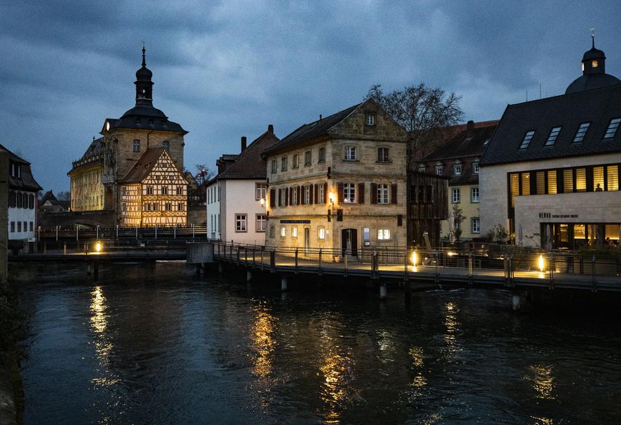 This photo taken on March 24, 2025 shows the night view of the ancient town of Bamberg in Bavarian state, Germany. (Xinhua/Zhang Fan)