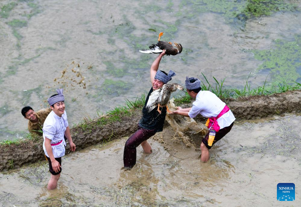 Villagers take part in a duck-catching activity during a cultural event in terraced fields in Congjiang County, southwest China's Guizhou Province, April 26, 2025. A various of cultural events were held here to showcase the local traditional farming and colorful ethnic costumes. (Xinhua/Yang Wenbin)