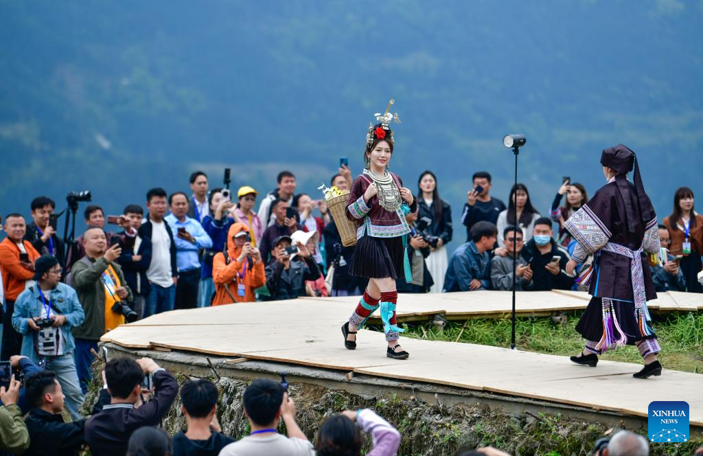 A fashion show is held during a cultural event in terraced fields in Congjiang County, southwest China's Guizhou Province, April 26, 2025. A various of cultural events were held here to showcase the local traditional farming and colorful ethnic costumes. (Xinhua/Yang Wenbin)