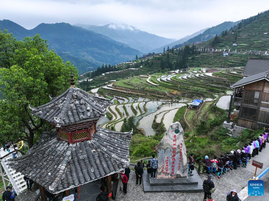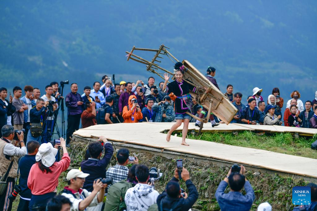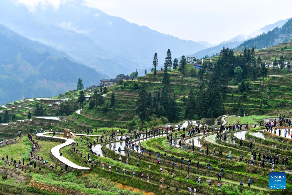 Villagers take part in a cultural event in terraced fields in Congjiang County, southwest China's Guizhou Province, April 26, 2025. A various of cultural events were held here to showcase the local traditional farming and colorful ethnic costumes. (Xinhua/Yang Wenbin)
