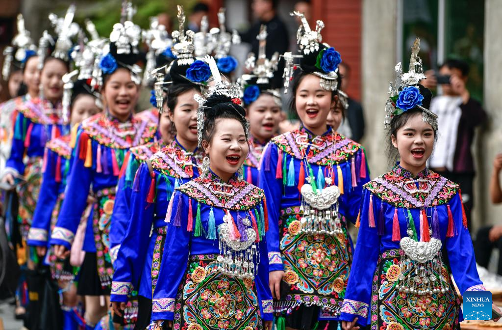 Girls dressed in ethnic costumes take part in a cultural event in Congjiang County, southwest China's Guizhou Province, April 26, 2025. A various of cultural events were held here to showcase the local traditional farming and colorful ethnic costumes. (Xinhua/Yang Wenbin)