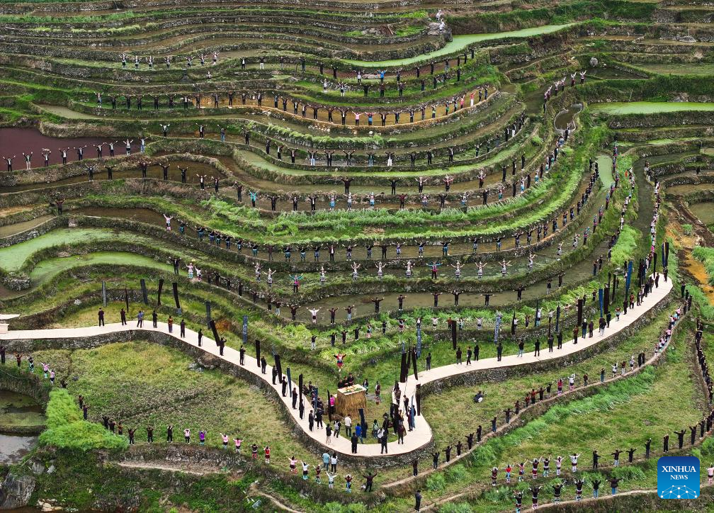 An aerial drone photo shows villagers taking part in a cultural event in terraced fields in Congjiang County, southwest China's Guizhou Province, April 26, 2025. A various of cultural events were held here to showcase the local traditional farming and colorful ethnic costumes. (Xinhua/Yang Wenbin)
