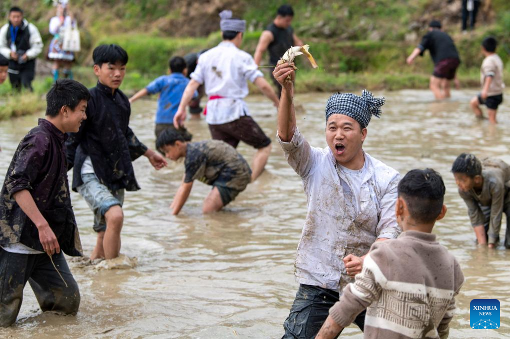 Villagers take part in a fish-catching activity during a cultural event in terraced fields in Congjiang County, southwest China's Guizhou Province, April 26, 2025. A various of cultural events were held here to showcase the local traditional farming and colorful ethnic costumes. (Photo by Wu Dejun/Xinhua)