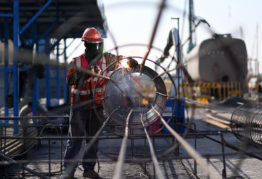 A worker works at the construction site of a new grain silo project of Tianjin Port in north China's Tianjin, April 25, 2025. (Xinhua/Zhao Zishuo)