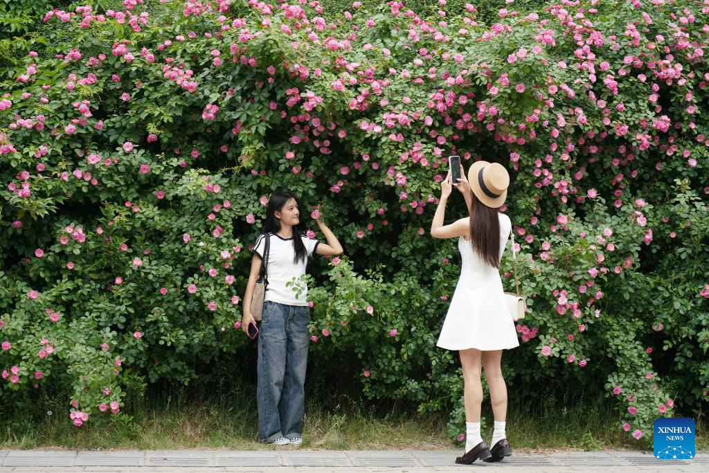 People enjoy flowers at a park in Xi'an, northwest China's Shaanxi Province, April 14, 2025. (Xinhua/Zou Jingyi)