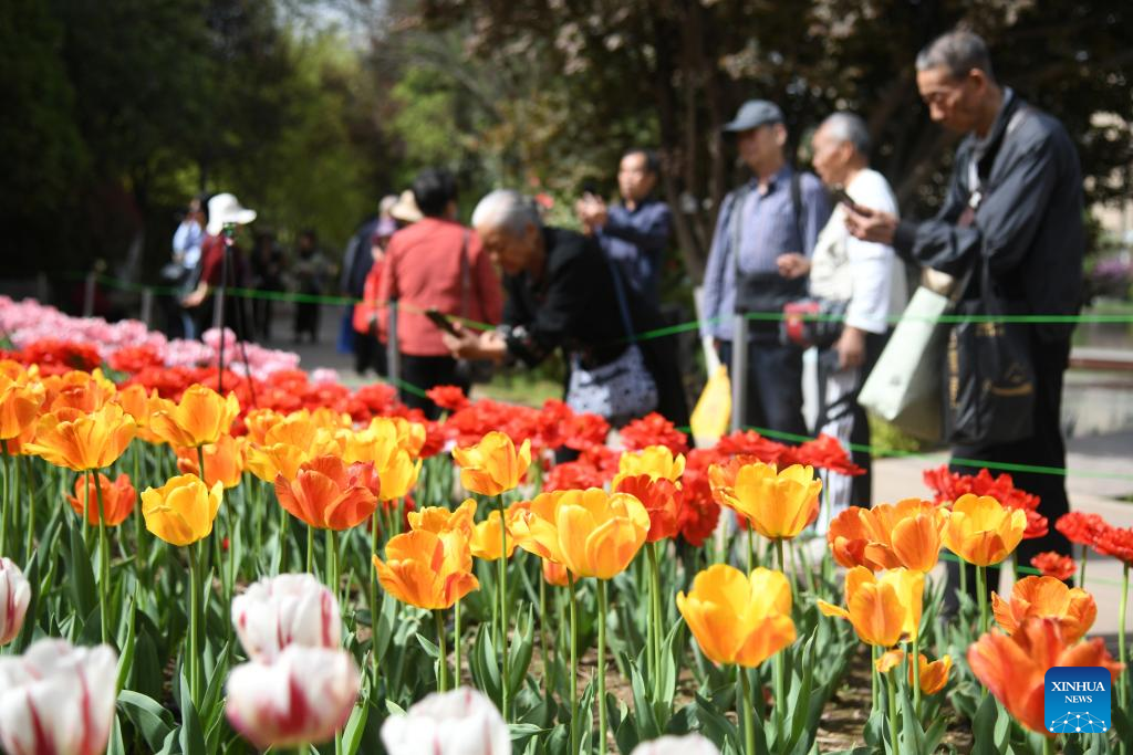 People enjoy tulips at Xi'an Botanical Garden in Xi'an, northwest China's Shaanxi Province, April 10, 2025. (Xinhua/Zhang Bowen)