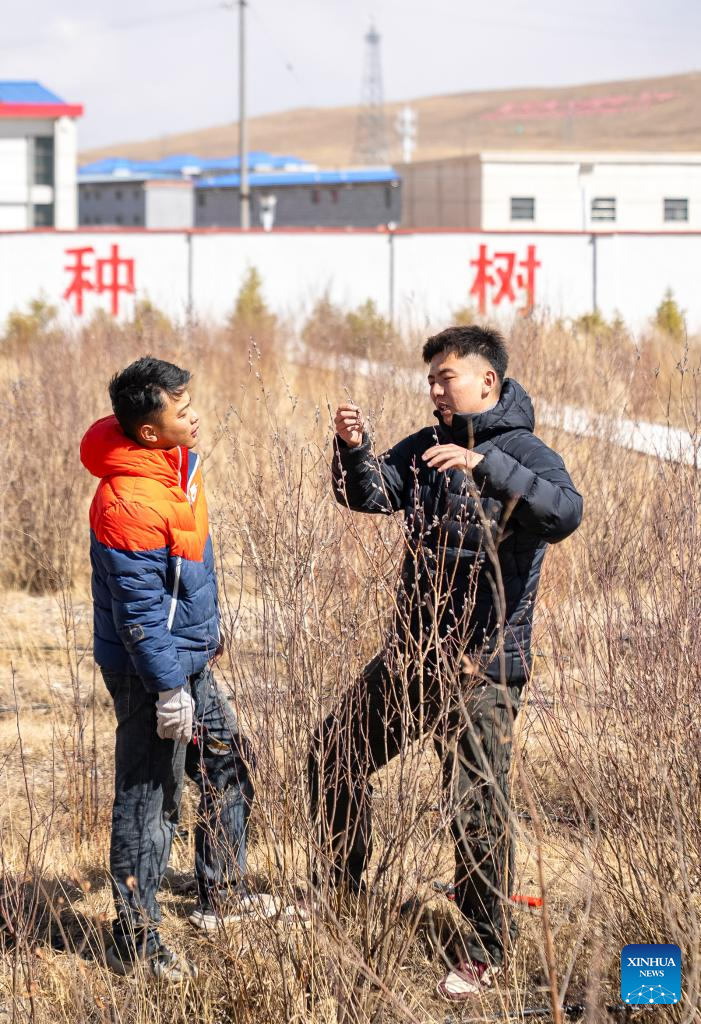 Staff members inspect the growth of trees in Nagqu, southwest China's Xizang Autonomous Region, April 25, 2025. Nagqu City has an average altitude of 4,500 meters. Due to the unfavorable conditions for tree growth, such as permafrost, low temperature, frequent strong wind throughout the year, it was once the only prefecture-level city in China without trees used for urban greening.