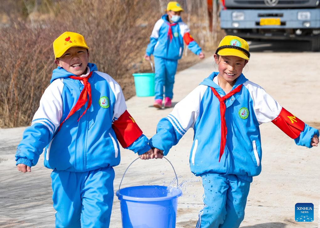 Students take part in a voluntary tree-planting activity in Nagqu, southwest China's Xizang Autonomous Region, April 25, 2025. Nagqu City has an average altitude of 4,500 meters. Due to the unfavorable conditions for tree growth, such as permafrost, low temperature, frequent strong wind throughout the year, it was once the only prefecture-level city in China without trees used for urban greening.