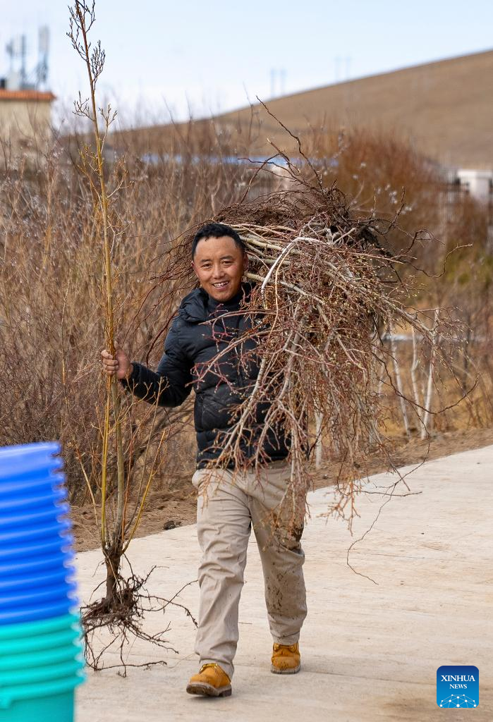 A man transport saplings in Nagqu, southwest China's Xizang Autonomous Region, April 25, 2025. Nagqu City has an average altitude of 4,500 meters. Due to the unfavorable conditions for tree growth, such as permafrost, low temperature, frequent strong wind throughout the year, it was once the only prefecture-level city in China without trees used for urban greening.