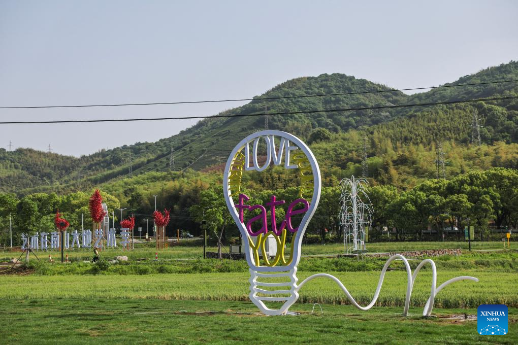 Villagers walk past an exhibited art work in the fields in Donglin Town, Huzhou City of east China's Zhejiang Province, on April 25, 2025. A land art event kicked off in the wheat fields in Donglin Town on Friday. Teachers and students from many Chinese fine arts academies formed the core creative team, producing 42 land art pieces here.