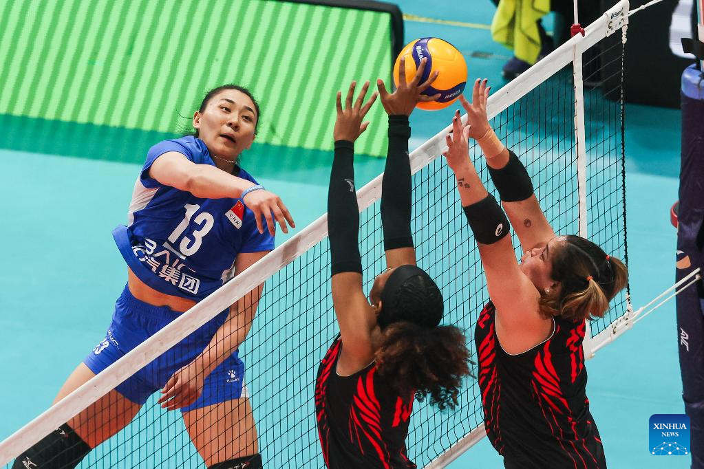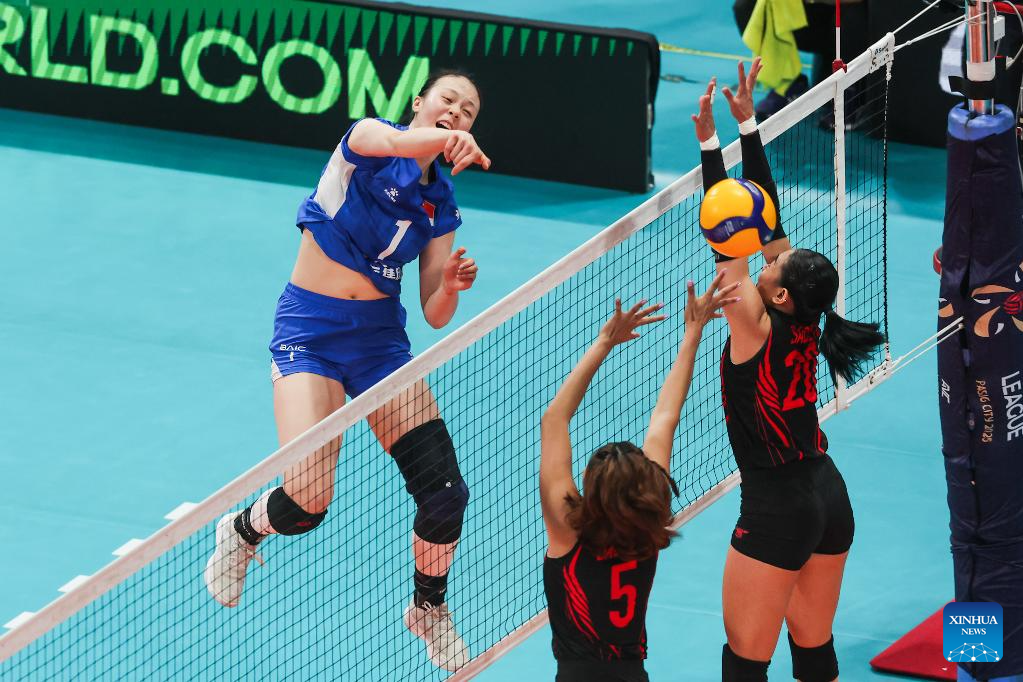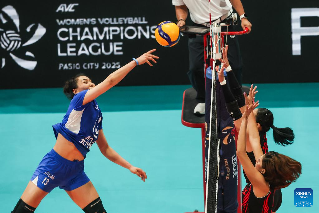Lu Yufei (L) of China's BAIC Motor Volleyball Club competes during the quarterfinal match between China's BAIC Motor Volleyball Club and the Philippines' Petro Gazz Angels at the AVC Women's Volleyball Champions League in Pasig City, the Philippines, April 25, 2025. (Photo by ROUELLE UMALI/Xinhua)