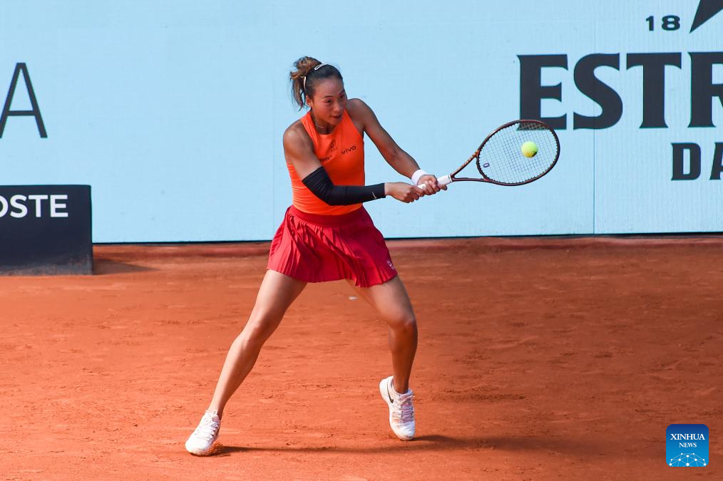Zheng Qinwen hits a return during the women's singles round of 64 match between Zheng Qinwen of China and Anastasia Potapova of Russia at the Madrid Open tennis tournament in Madrid, Spain, April 25, 2025. (Photo by Gustavo Valiente/Xinhua)