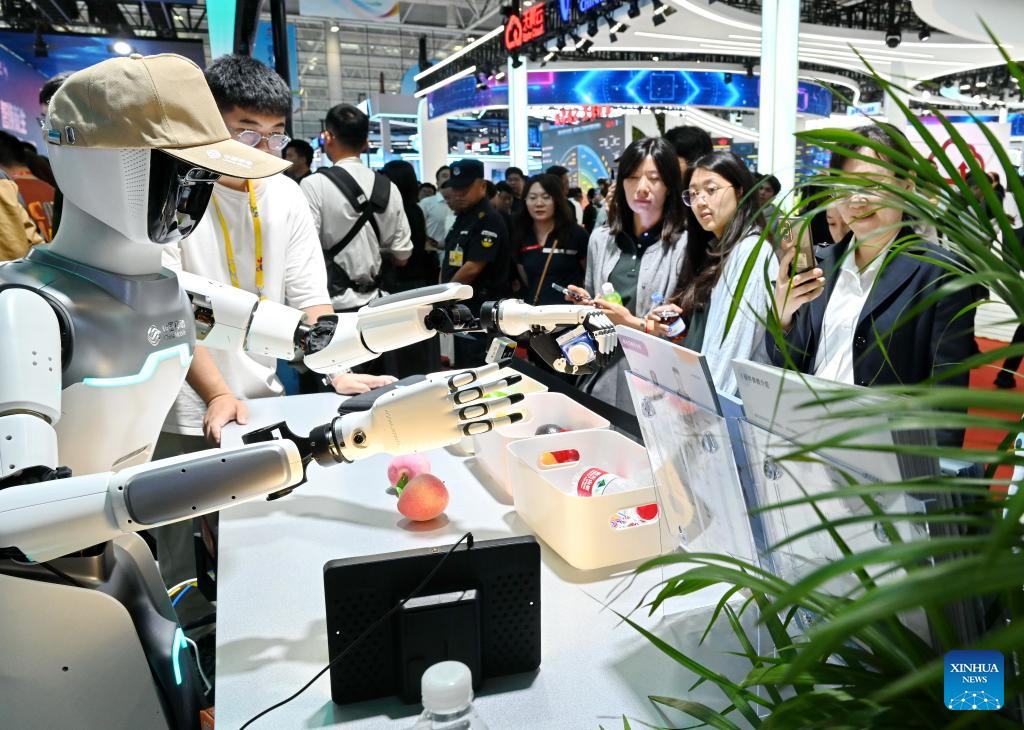 A visitor interacts with a humanoid robot at the experience area of the 8th Digital China Summit in Fuzhou, southeast China's Fujian Province, April 28, 2025. With more than 300 professional institutions attending, the 8th Digital China Summit opened its experience area to professional visitors on Monday, showcasing the nation's digital transformation achievements amid robust growth in the digital sector. (Xinhua/Lin Shanchuan)