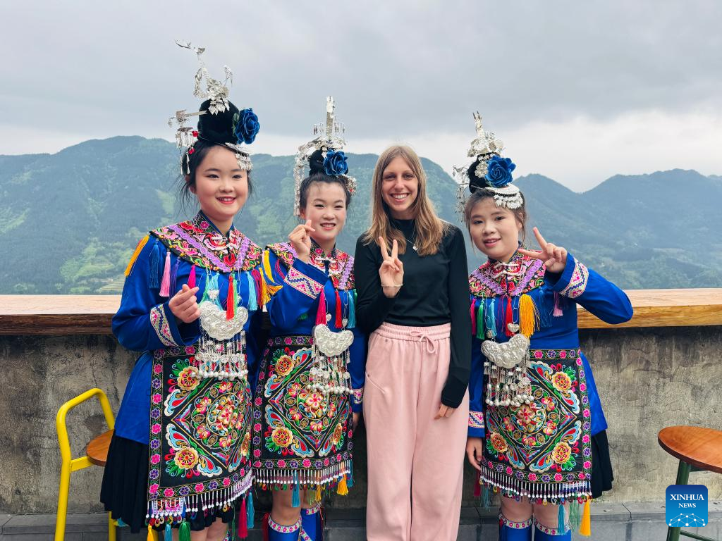Lucie Portet (2nd R), a tourist from Paris, France, poses for a group photo with local ethnic minorities near terraced fields of Jiabang in southwest China's Guizhou Province, April 26, 2025. (Xinhua/Zhou Xuanni)