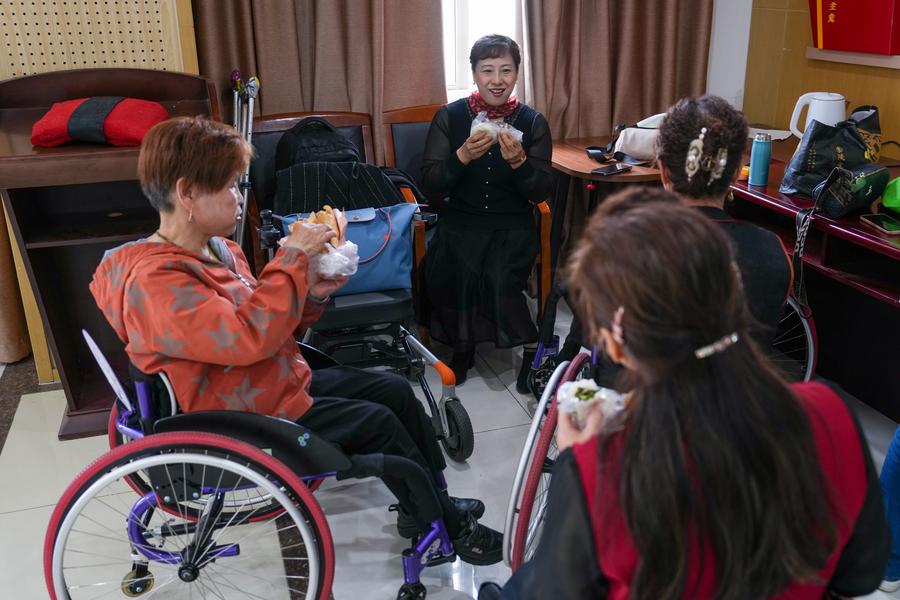 Song Aixia (2nd L) and teammates have lunch before performing wheelchair dance for community residents in Nanjing, east China's Jiangsu Province, April 27, 2025. (Xinhua/Li Bo)