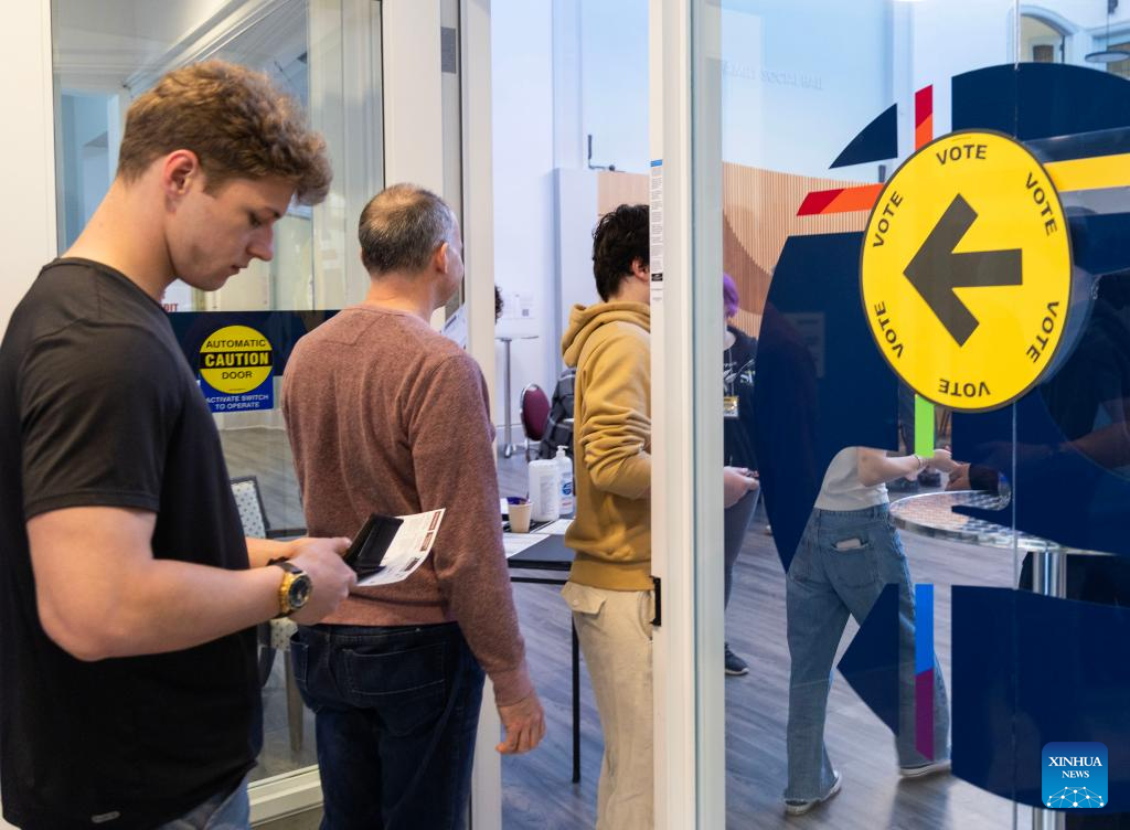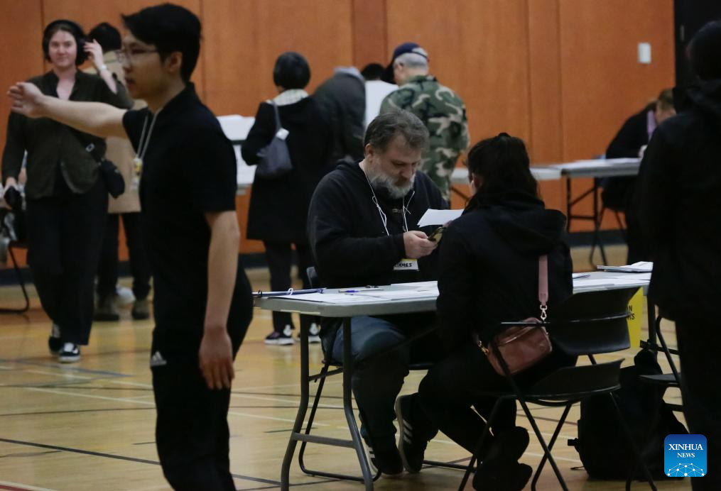 People arrive at a polling station in Vancouver, British Columbia, Canada, on April 28, 2025. Millions of Canadians are lining up to cast their ballots on Monday as U.S. President Donald Trump weighed in on the election with a new threat of annexation of the country. (Photo by Liang Sen/Xinhua)